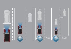 Adaptive Cruise Control (ACC) membantu menjaga kestabilan kecepatan kendaraan dan mengatur jarak dibelakang kendaraan yang terdeteksi didepan.